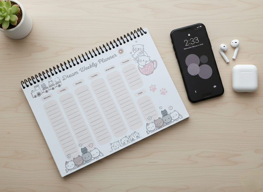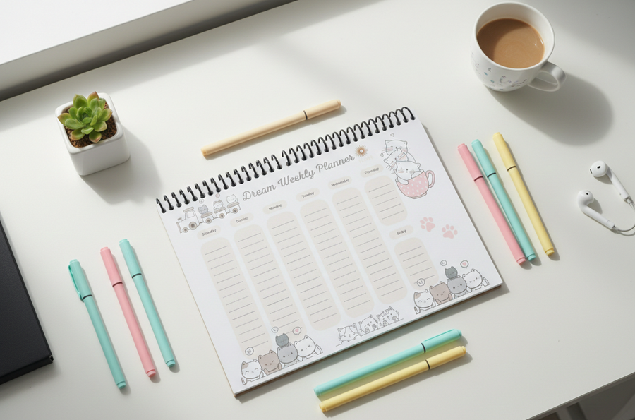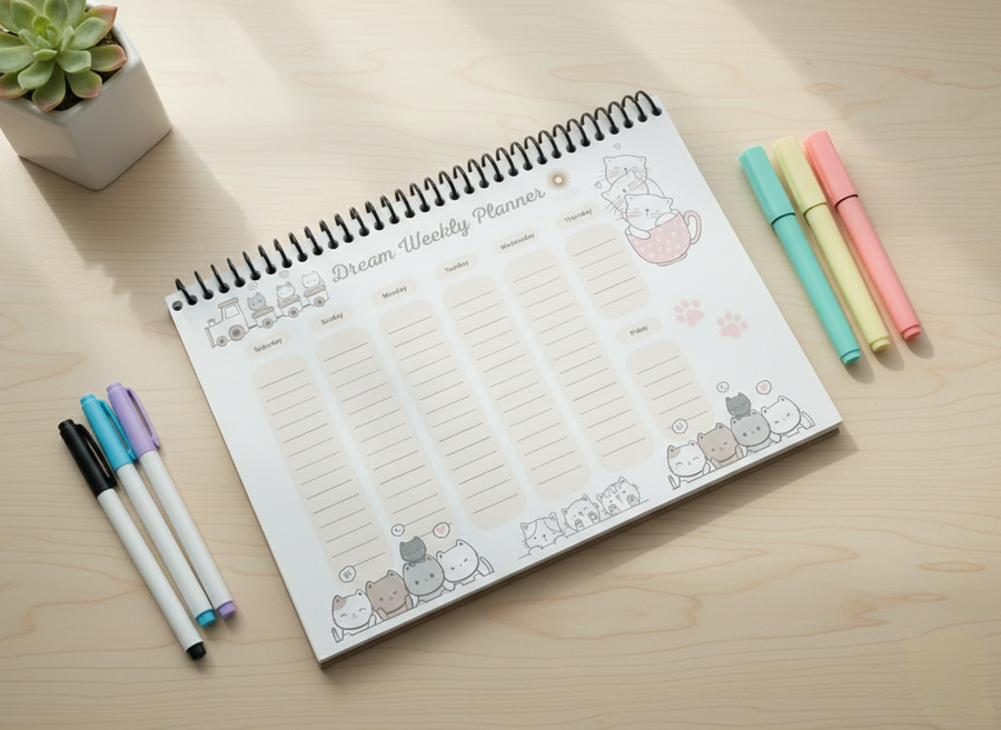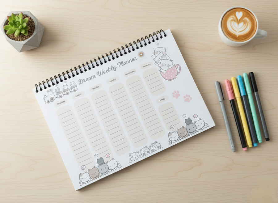 بلانر قطط أسبوعي مطبوع بتصميم كيوت وألوان باستيل لتنظيم المهام والمواعيد بطريقة لطيفة ومبهجة.